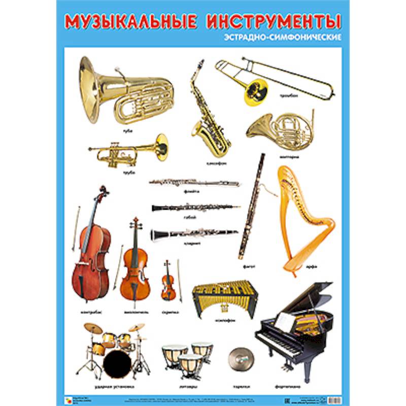 Плакат большого формата «Музыкальные эстрадно-симфонического инструменты» познакомит детей с разными видами эстрадно-симфонических инструментов: ударными, струнными, духовыми. Четкие красочные фотографии обязательно заинтересуют детей.