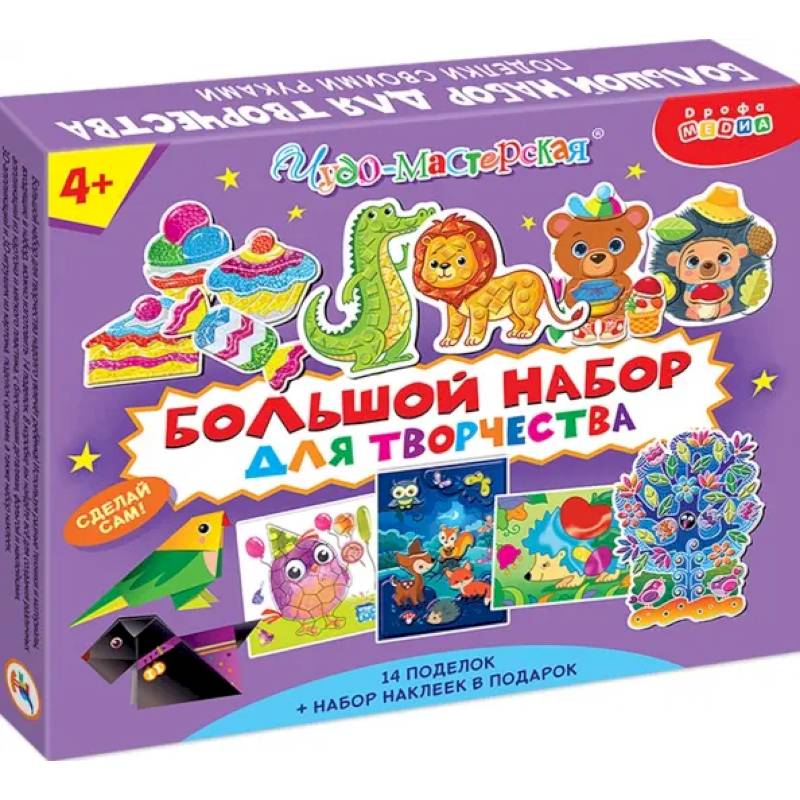 Большой набор для творчества надолго увлечёт ребенка! Используя разные техники и материалы, входящие в набор, можно изготовить 14 поделок.