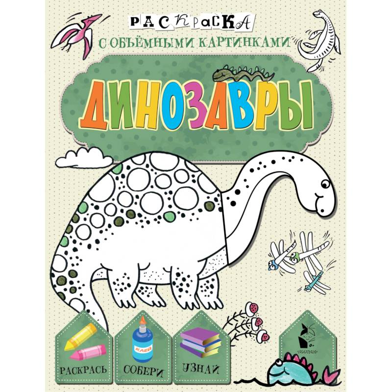 Эта раскраска необычная: в ней есть не только картинки с красочным фоном, но и дополнительные элементы на отдельных листах, которые тоже нужно раскрасить, выдавить и наклеить по схеме на основную картинку. Теперь так легко сделать собственными руками объемные модели динозавров, а заодно дать волю фантазии, развить творческие способности и сообразительность!
