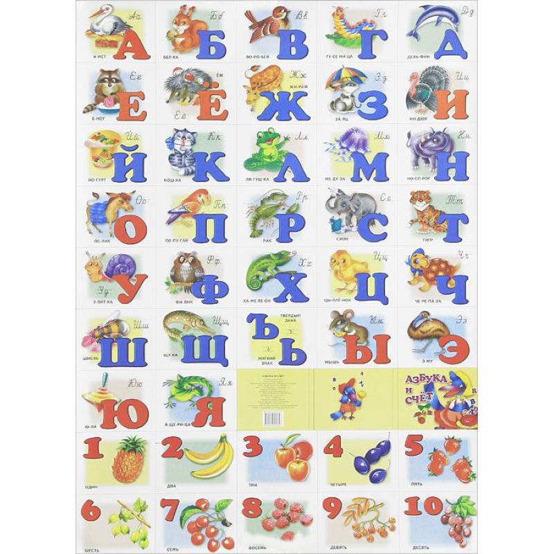 Настоящее издание представляет собой плакат с русским алфавитом и цифрами от 1 до 10 и картинками к ним.